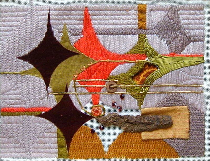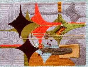 For a long time, this piece didn’t have a name, just “Untitled”. It had started out as an experiment using repeated shapes. During the thinking, doodling phase, I remembered a teacher once mentioning the challenge of using a hole as part of a design. So, feeling very brave, I cut one in the canvas, echoing the diamond shapes that I had already started. The whole thing just grew from other found objects around the studio. My diamonds didn’t exactly smooth out, but they gradually grew to like each other.