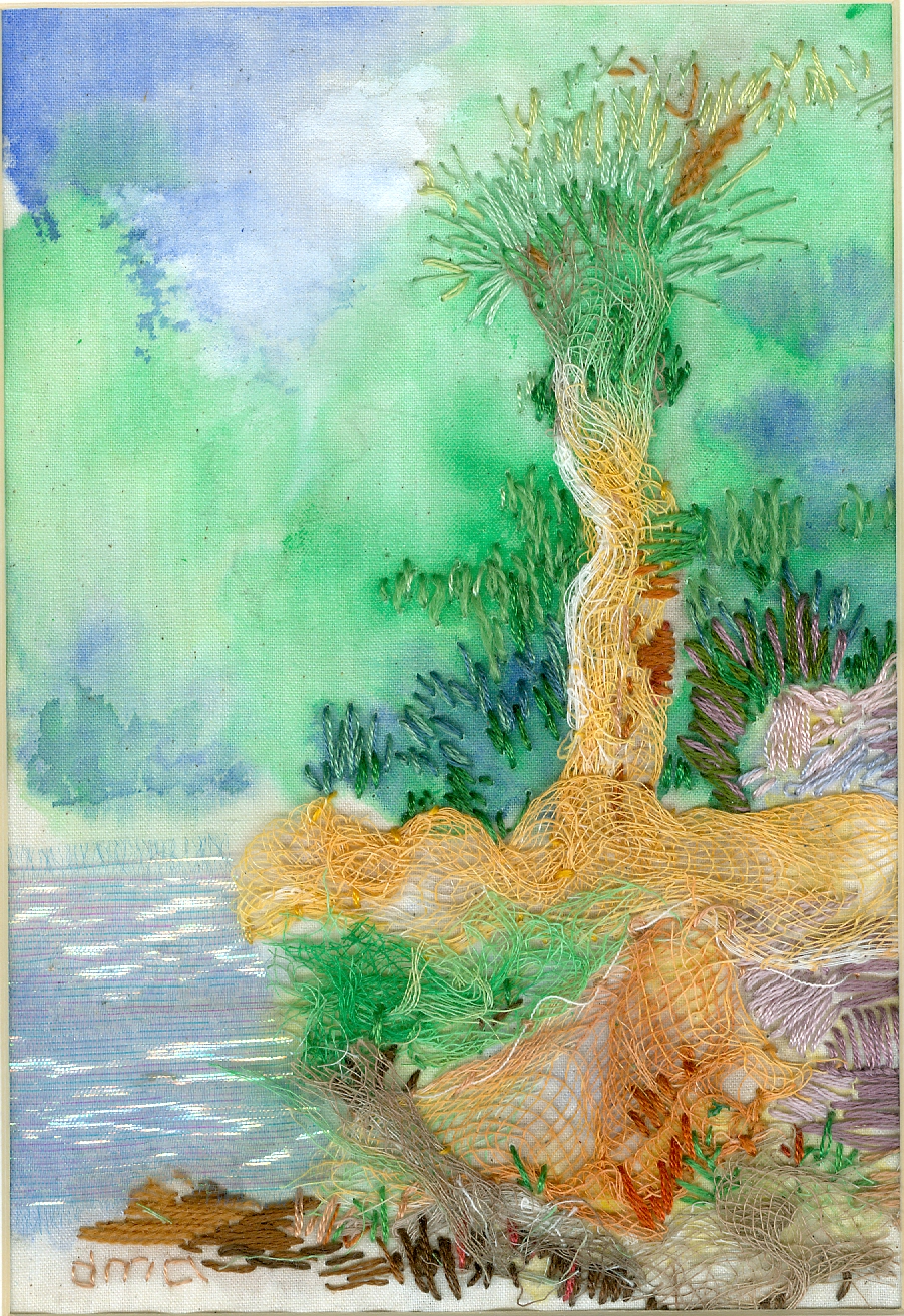 I think that the sky was in watercolor and the distant area next was of some thin fabric. Somewhere I had acquired the mesh, and I wanted to play with it to see what could develop. The tree and rocks resulted, obviously remembered from some I had seen somewhere, sometime. One part, the pond, I’m particularly pleased with. I had painted it with light blue, but it didn’t really look ”right”. Months later, I found the lovely, shimmering hunk of whatever, just the right size, and it worked! This is one of my smallest designs in a while, but it was huge to me.