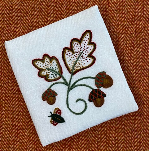 The inspiration for The Acorn Hill Needlebook comes from the woods behind my family home. Our home was built in 1954 by my paternal grandparents and designed by my grandmother’s brother and father. It is truly a family home! Our home sits on 2.5 acres of oak woodland and the views from our living room give the impression of being in the trees. Naturally, squirrels love all the acorns and spend the entire year either eating or collecting them. My mother gave our home the name “Acorn Hill” when she ran a B&B years ago. She was always so supportive of all my creative endeavors, and showed her friend photos of everything I embroidered. This little needlebook in in remembrance of all the family who has lived and gathered here over the last almost 70 years.