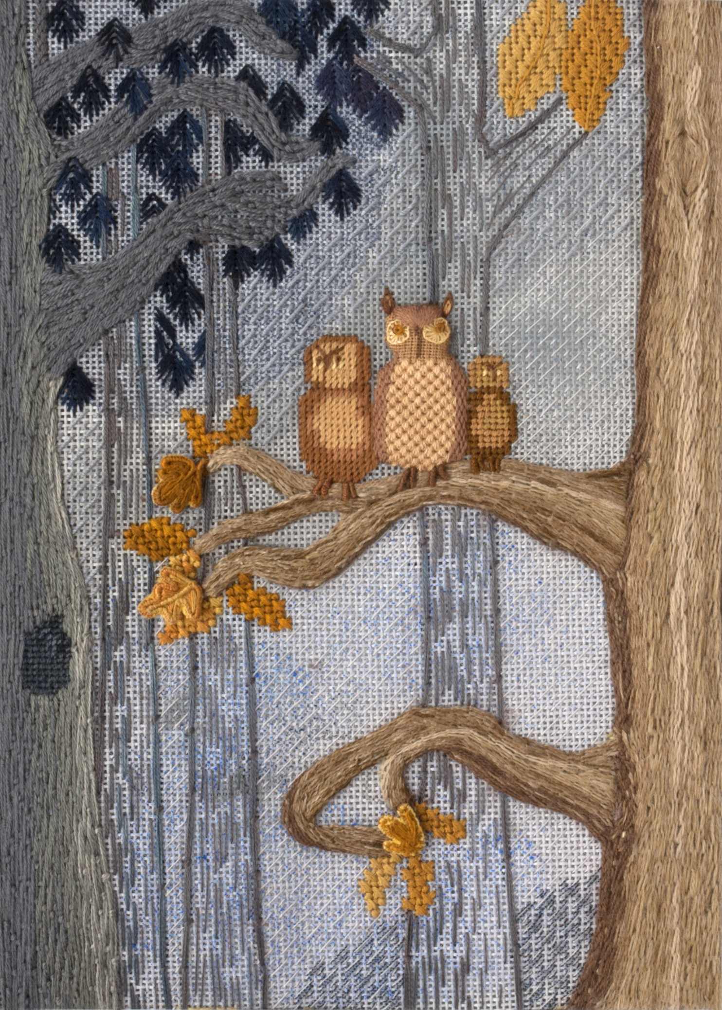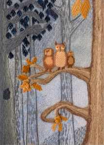 The curvy trees and darkness of this scene get their inspiration from a French Gobelin tapestry. In this piece, I played with light and dark, and near and far, to create a forest scene with these three mysterious owls. To differentiate foreground and background objects, I used a variety of threads in related color values, as well as layers of tulle under the stitches. The watchful owl that is the focal point of the design uses an appliqué of Penelope18/36 canvas to the ground canvas. I have included a variety of traditional canvas stitches, as well as those more typically found in surface embroidery. The tree on the left is made with Bokhara Couching, and the one on the right is Raised Stem Stitch over Padding. Designed for NAN Teacher Certification.