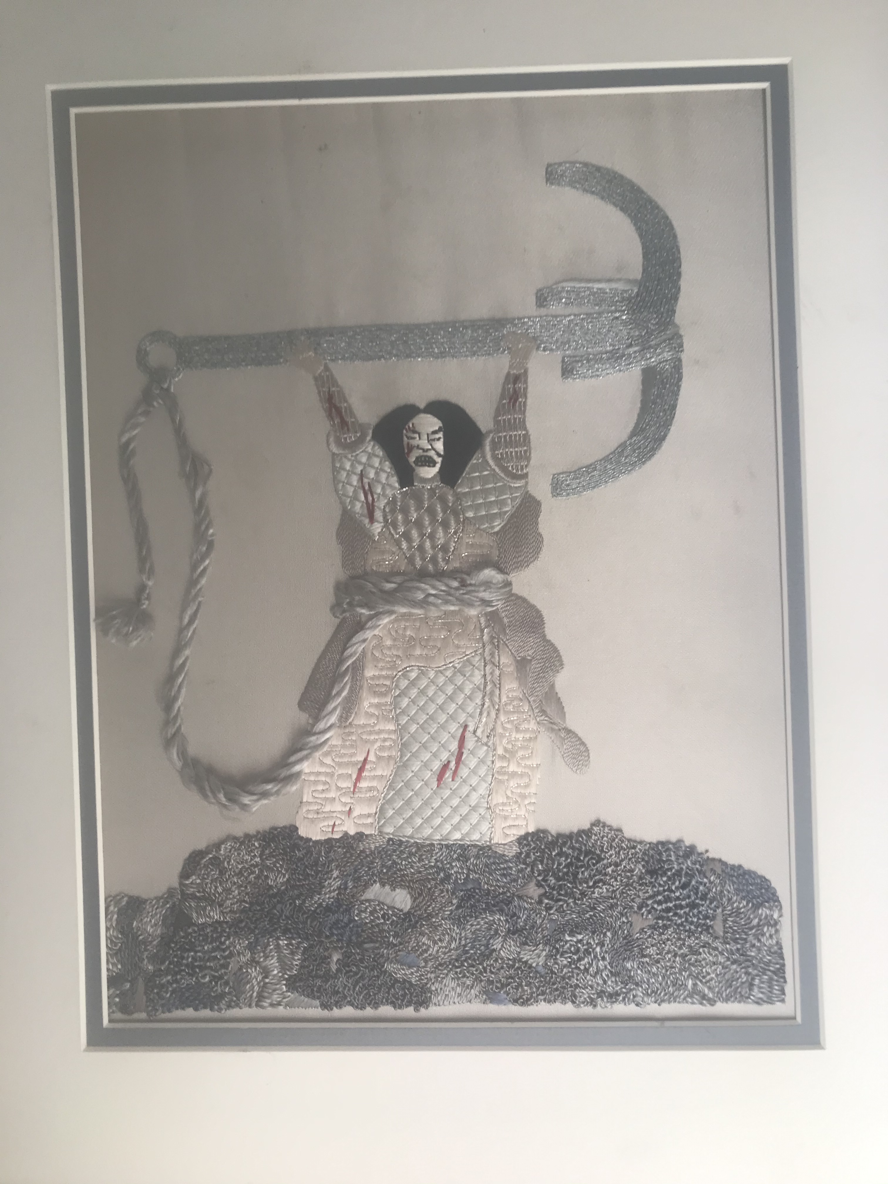 This piece was my final Teacher Certification piece. Needless to say, it was a rough year for me. I based the figure on a Noh (Japanese)Theatre actor. In the story, this man had lost the war, turned his family over to his enemies and was doing the honorable thing by committing suicide. It is done in silk threads and silver on silk fabric.