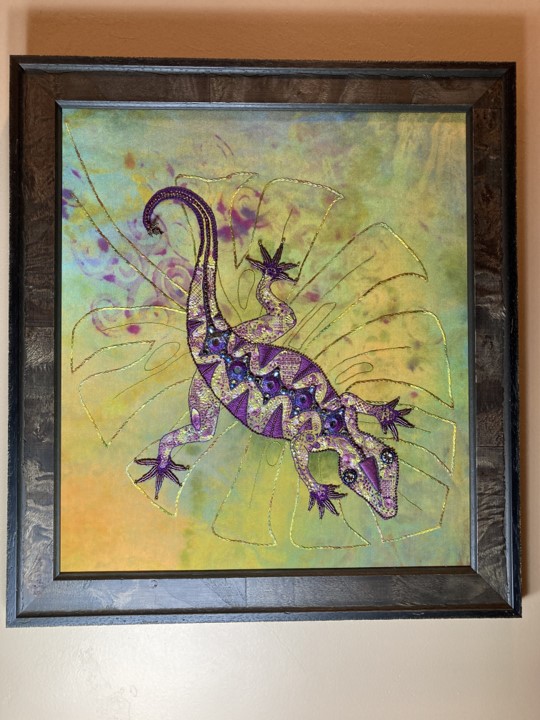 Lazarus is the result of our Green Bay Area Chapter of the EGA study in Shisha mirrors. I wanted to use the shisha mirror embroidery in conjunction with the other mixed media embroidery that I like to do. The head is free form embroidery, and the body is embroidered using various stitches on hand dyed silk. The five, four-pointed stars down the lizard’s back are the shisha mirror embroidery which give the lizard a certain sparkle. The eyes are flat backed crystals. Beads play a predominant role in the textural embroidery. He is sitting on a leaf which is suggested by the chainstitched outline in the background.