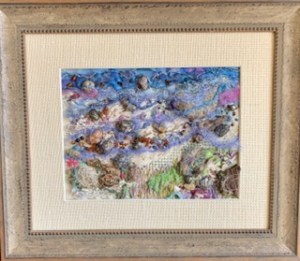 I tried working with Dawn’s elegant color pallet but I couldn’t be that elegant. I like giving the beach texture by using pulled work. The beach at our cottage had more than sand. It had a lot of rocks and weeds and sticks and footprints. Not much of it was nice smooth sand. I was especially interested creating the look and texture of water. Since there were lots of rocks in the water, I used sheers over the rocks and around the rocks to give the feeling of waves and water.