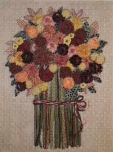 I purchased this painted canvas by Mary Beth Baxter at a local shop and presented it to Debbie Stiehler to recommend threads and stitches for her class at NAN Assembly, Interpreting the Painted Canvas at NAN in 2018. When I returned home, it went into my stash until COVID-19 presented the opportunity to finish it while sheltering at home. It now has a place of honor in my woman-cave.