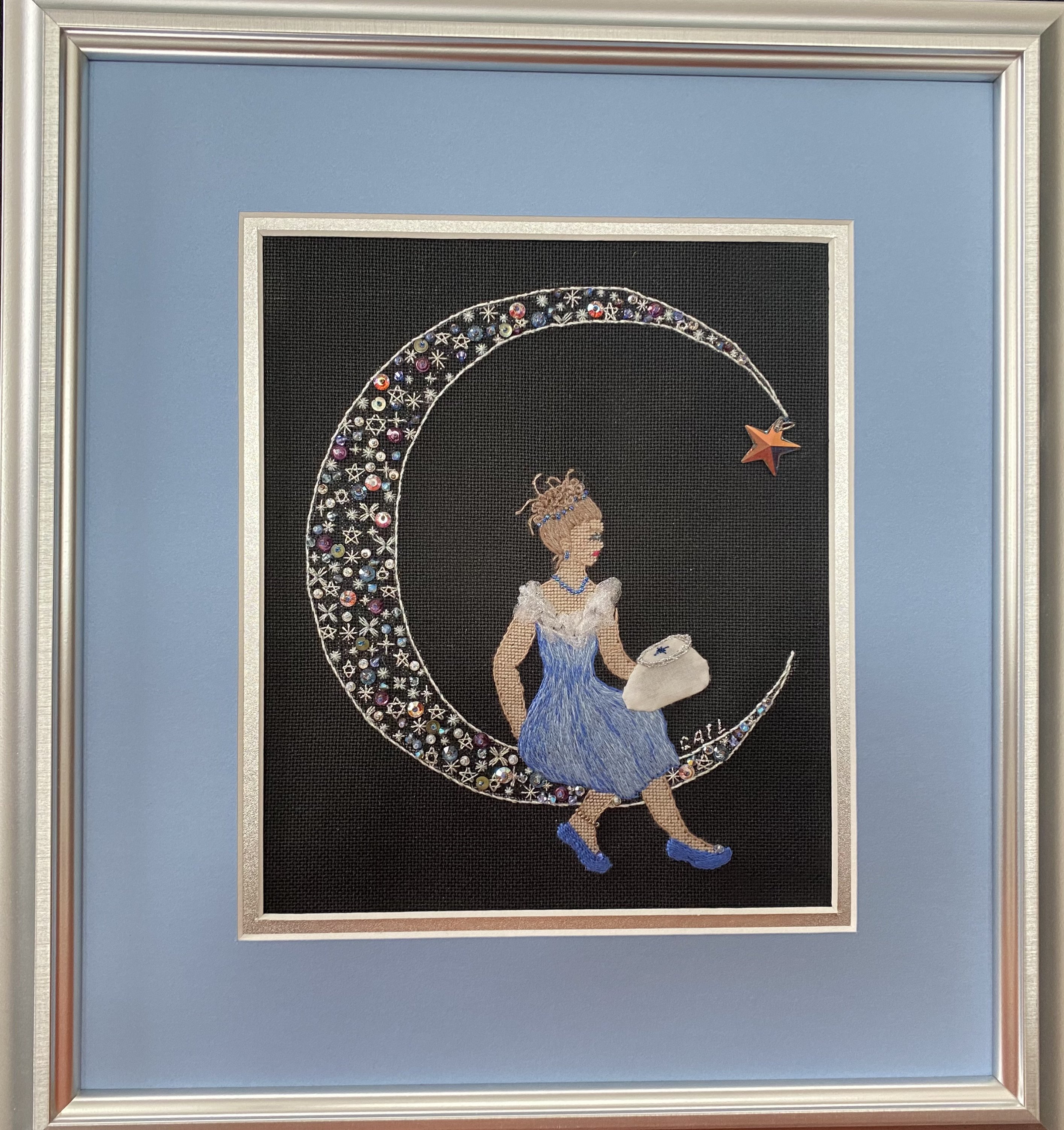 Gemma di Luna is a whimsical piece inspired by the DreamWorks logo. The stitching figure is worked in mostly embroidery stitches, and the fabric on which the girl is working is a real piece of fabric. The moon is studded with various attachments such as sequins, flat backs, paillettes, and beads. In addition, a few stitches that can stand on their own—such as Smyrnas, four-way Continental, and Diamond Cross—are used to fill the moon. I also employed various star shapes, some found in books and online, and some of my own device.
