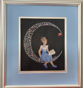 My intention was to stitch a large star at the upper point of the crescent moon, but I couldn’t locate the chart I sought, and finally realized that the earrings I was wearing were the perfect enhancement for the piece. And so, I sacrificed the earrings “for the sake of art”.