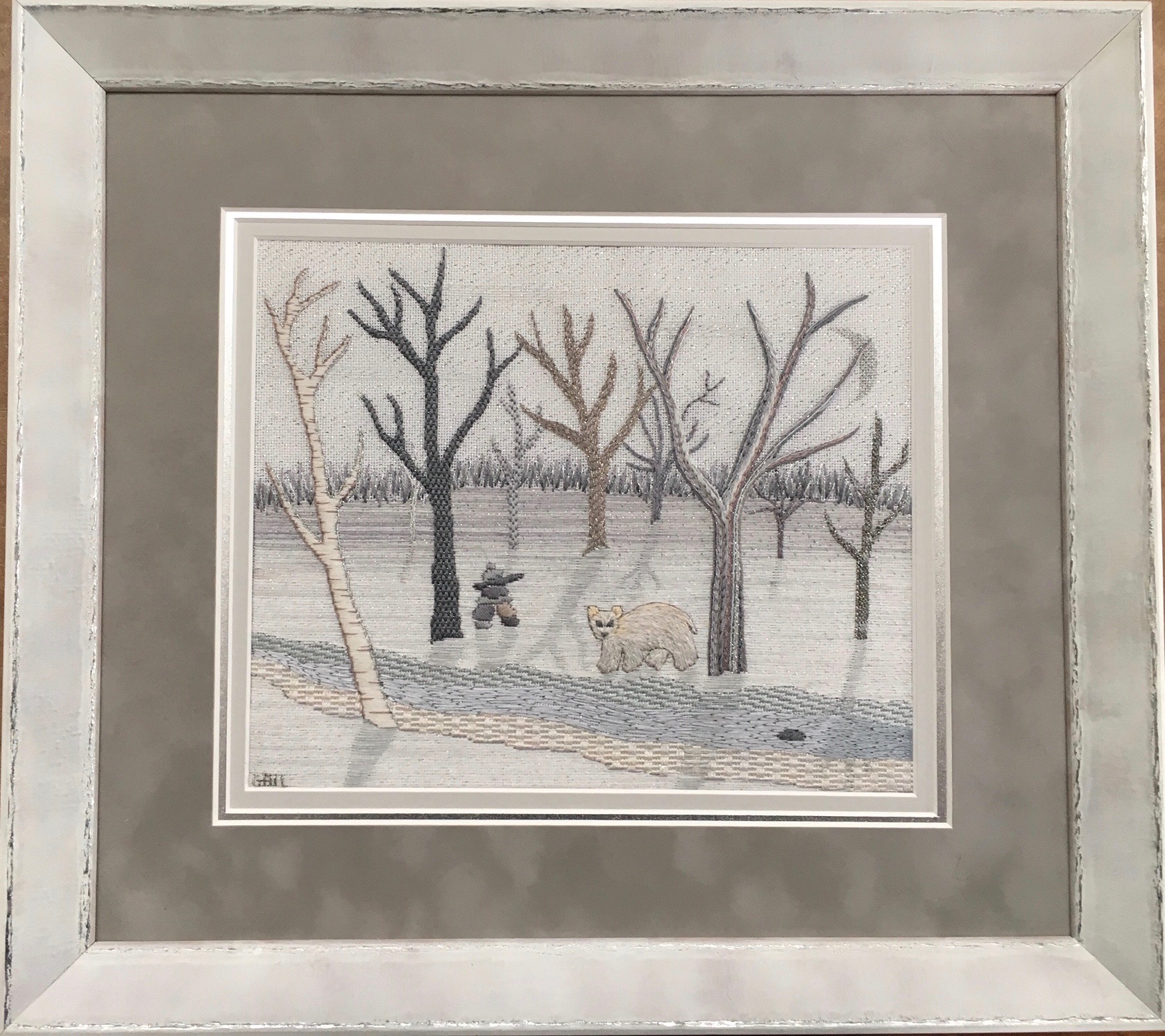 The Land of the Spirit Bear captures the animal in embroidery, in his traditional habitat, a forest of deciduous trees. Our bear is embraced by a variety of leafless trees springing from the snowy landscape. An icy river flows through the painting and grasses occlude the horizon. Accompanying the bear is an Inukshuk, a native Canadian icon, used to indicate a geographic feature such as a waterfall, or to point the way to a trail.