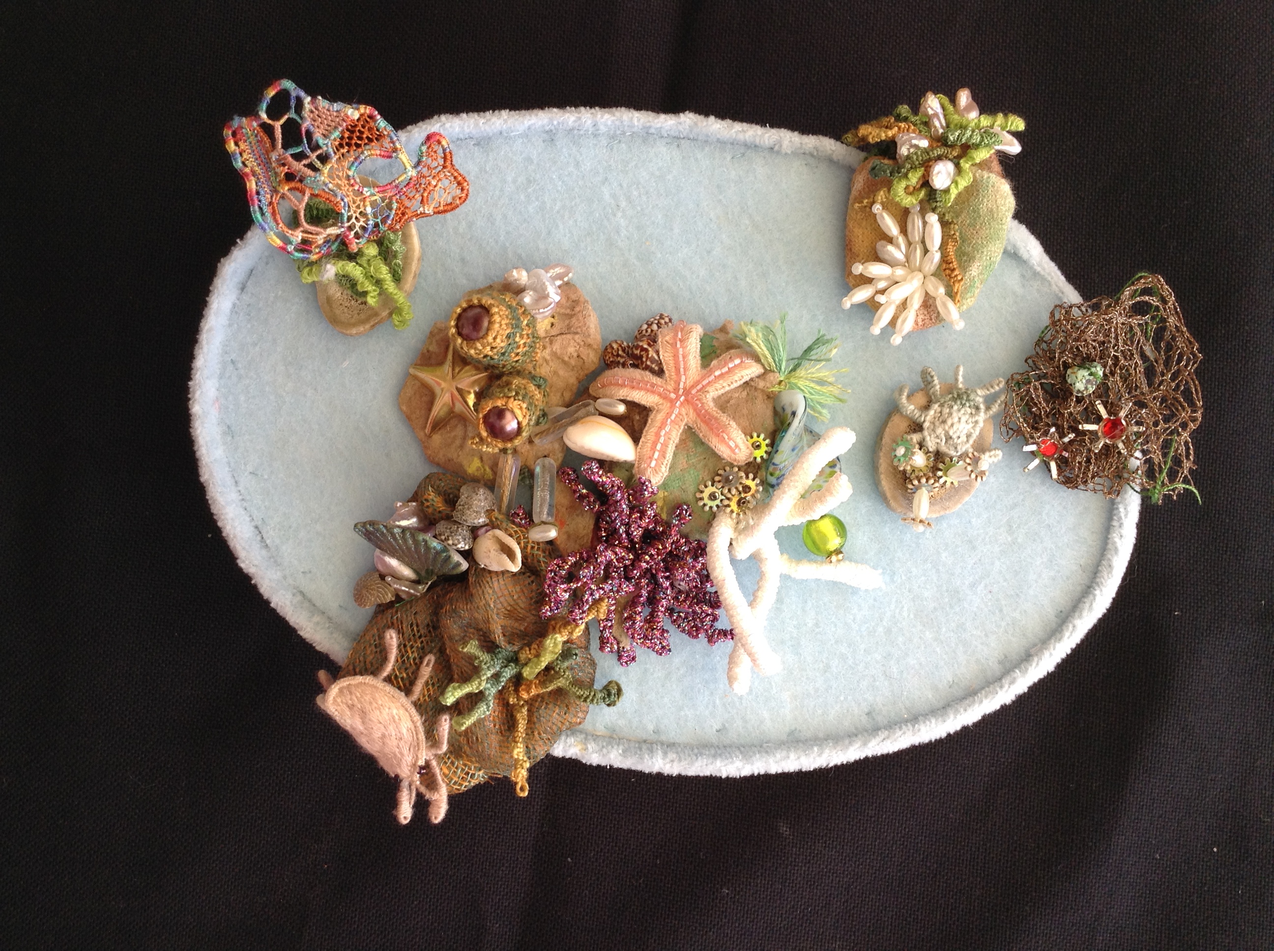 In the case of this porcelain box the two art forms came together. While painting this lovely 6” oval box I broke the lid. I decide to make a cardboard lid and decorate it with Stumpwork embroidery. The painted base has various water scenes painted around it along with shells, the top is decorated with miscellaneous found objects and Stumpwork sea creatures. The lid decoration includes needlelace, beads and shells, three rocks that are painted pieces of an egg carton, and one rock of open weave fabric painted and gathered into a circle.