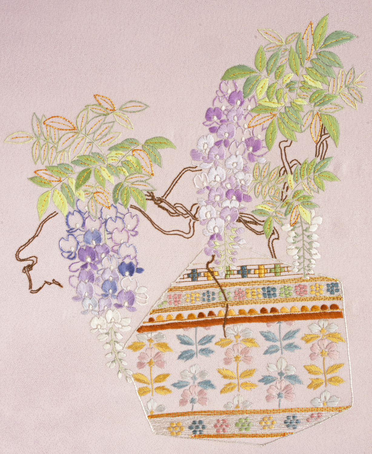 This piece of Japanese embroidery is in a different style then other pieces of this type of embroidery. Wisteria was a type of flower I have been desiring to embroider. I enjoyed using the colors that to me are very pleasing to the eye. I liked the simplicity of this design as compared to other designs. I enjoyed doing the embroidery on this piece and I will continue with my journey with Japanese embroidery.