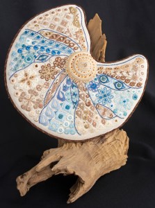 Under the Summer Sun transports me to summer and the beach, with the colors, the shape, and the center shell. The choice of pecky Cypress for the display stand compliments the beachy feel of the piece. As a pilot stitcher for this piece, I “visited” the beach often! Piloting was a great experience, requiring attention to detail and offering the opportunity to make suggestions so the instructions would be even better.