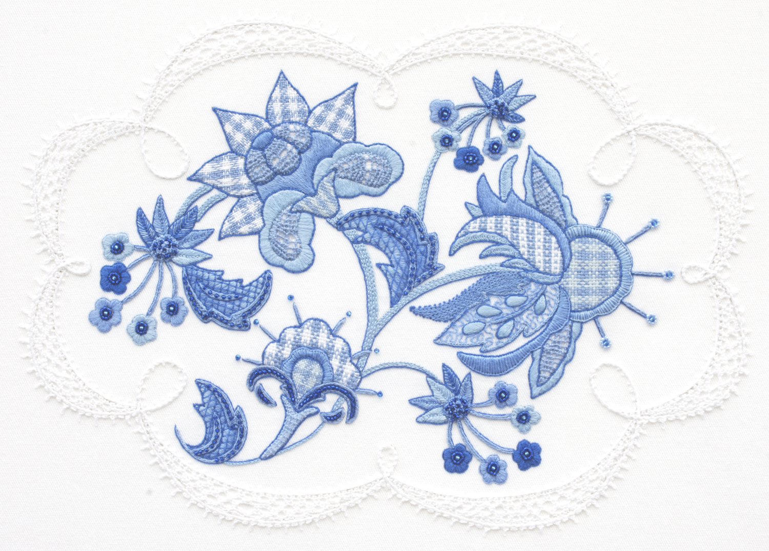 Inspired by the colors of English bone china, this 10” x 8” design by Hazel Blomkamp is worked on cotton hopsack and incorporates surface embroidery, needle lace, needle weaving and bead embroidery techniques. The materials include #12 perle, #80 and stranded cottons, rayon threads, and Miyuki seed beads.