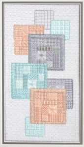 Sisters is a design by Nancy Cucci. Sisters was stitched with cotton threads, and bead and crystal embellishments. This project included a technique for personalization using straight stitches creating “holes” to form alphabets. I personalized the piece with my initials and the initials of my best friend from college because she is like a sister to me. Because I do have a sister, I am filled with guilt when I admire this piece and have vowed to stitch another Sisters in the future for my real-life sister!