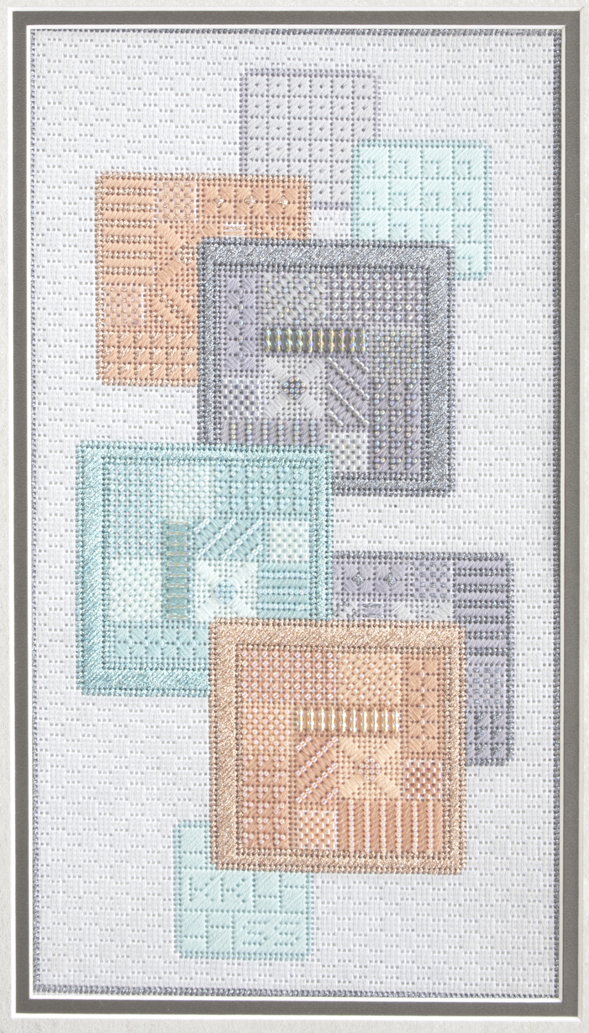Sisters is a design by Nancy Cucci. Sisters was stitched with cotton threads, and bead and crystal embellishments. This project included a technique for personalization using straight stitches creating “holes” to form alphabets. I personalized the piece with my initials and the initials of my best friend from college because she is like a sister to me. Because I do have a sister, I am filled with guilt when I admire this piece and have vowed to stitch another Sisters in the future for my real-life sister!
