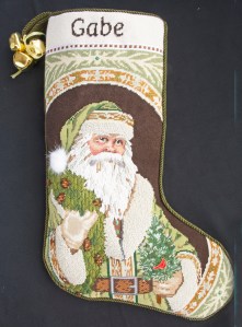 This Christmas stocking, designed by Liz-Goodrick Dillon, was inspired by, and stitched for, Linda’s four-year old grandson, Gabe. Gabe is legally blind. He does have some vision, but has no depth perception, so the goal in stitching this was to ignore three-dimensionality in favor of texture, texture, texture.