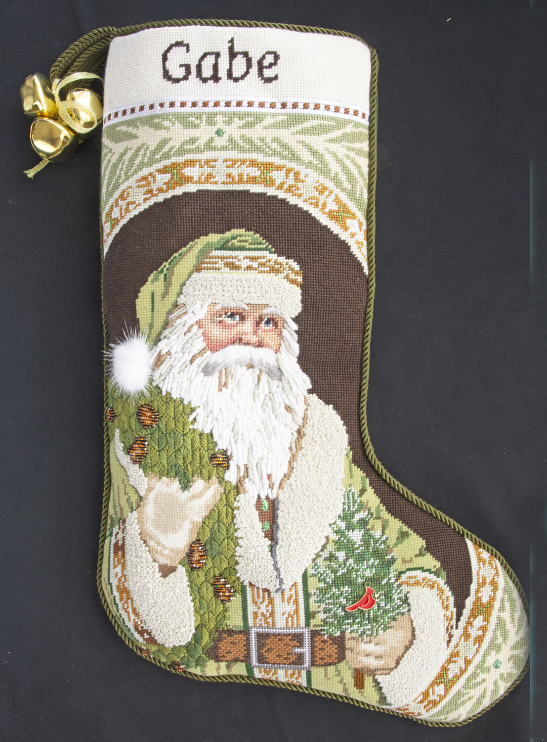 Santa’s beard, stitched in three colors in bullion stitch with Vineyard Classic Silk, is the focal point. Long and short stitch is used for his mustache. His collar and cuffs are French knots using Planet Earth Silk. Santa’s robe is in tent stitch using Very Velvet. Texture was added to his gloves by using Angora. The wreath that Santa holds and the tree were stitched using Watercolours, which added a nice texture. Finishing touches include a faux mink pom pom on his hat, a cardinal charm on the tree, and jingle bells.