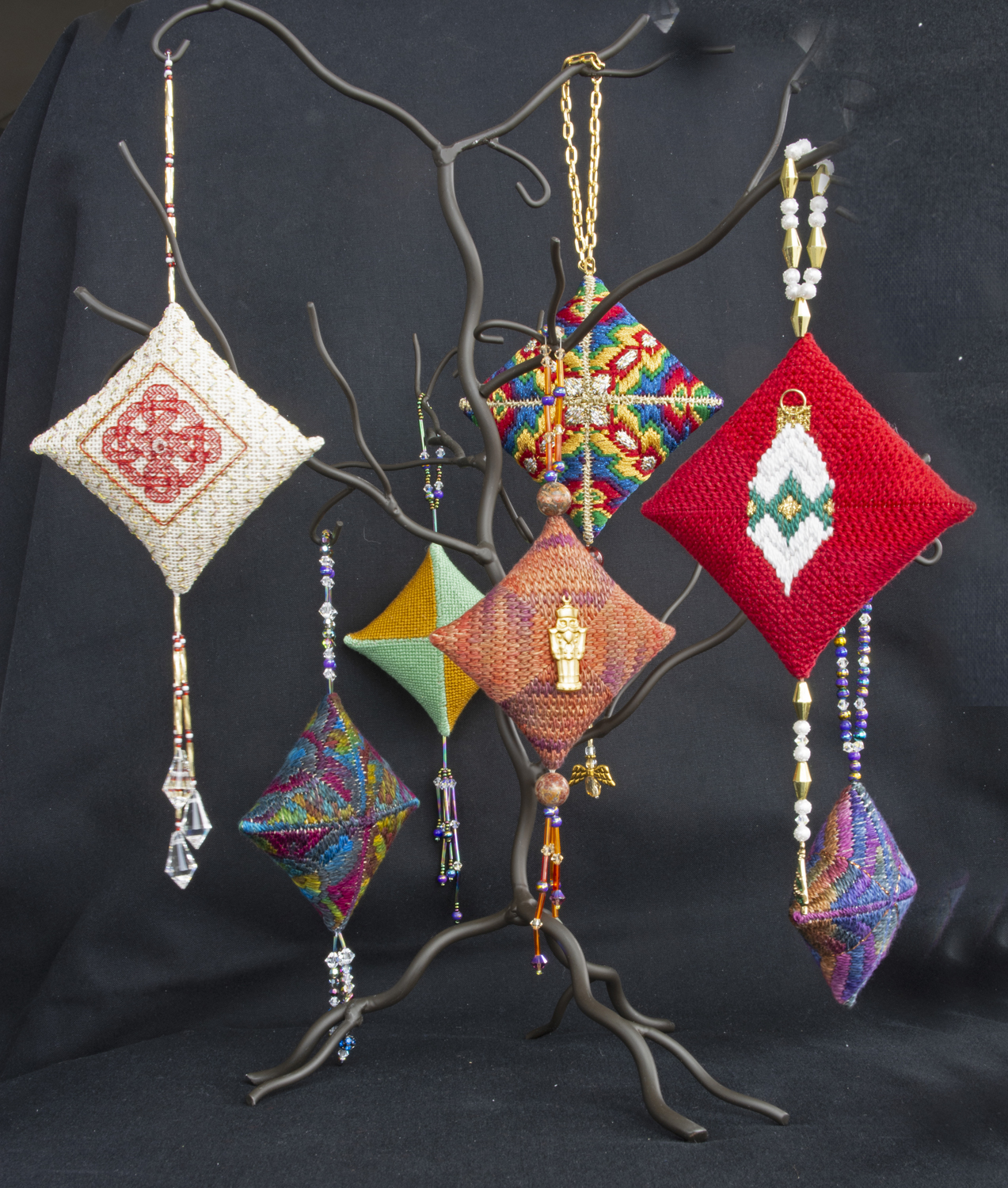 It was fun to play with a variety of fibers from my stash and various stitches (mostly familiar ones) on both 16 count and 18 count canvas. Once the stitching was done, I trimmed the pieces to four threads beyond the stitching, finger-folded the unworked canvas to the back and pinned it in place. I stitched the vertical seams, sometimes with an extra stitch or two at the beginning, starting at the center point and stitching to the corners, being careful to keep the corners aligned, using a simple overcast stitch. Once the vertical seams were stitched, I used a variety of beads and crystals in colors coordinating with the stitching to create hangers and, in most cases, tassels. Then the horizontal seams were stitched about halfway each, stuffing added, and then the seams completed.