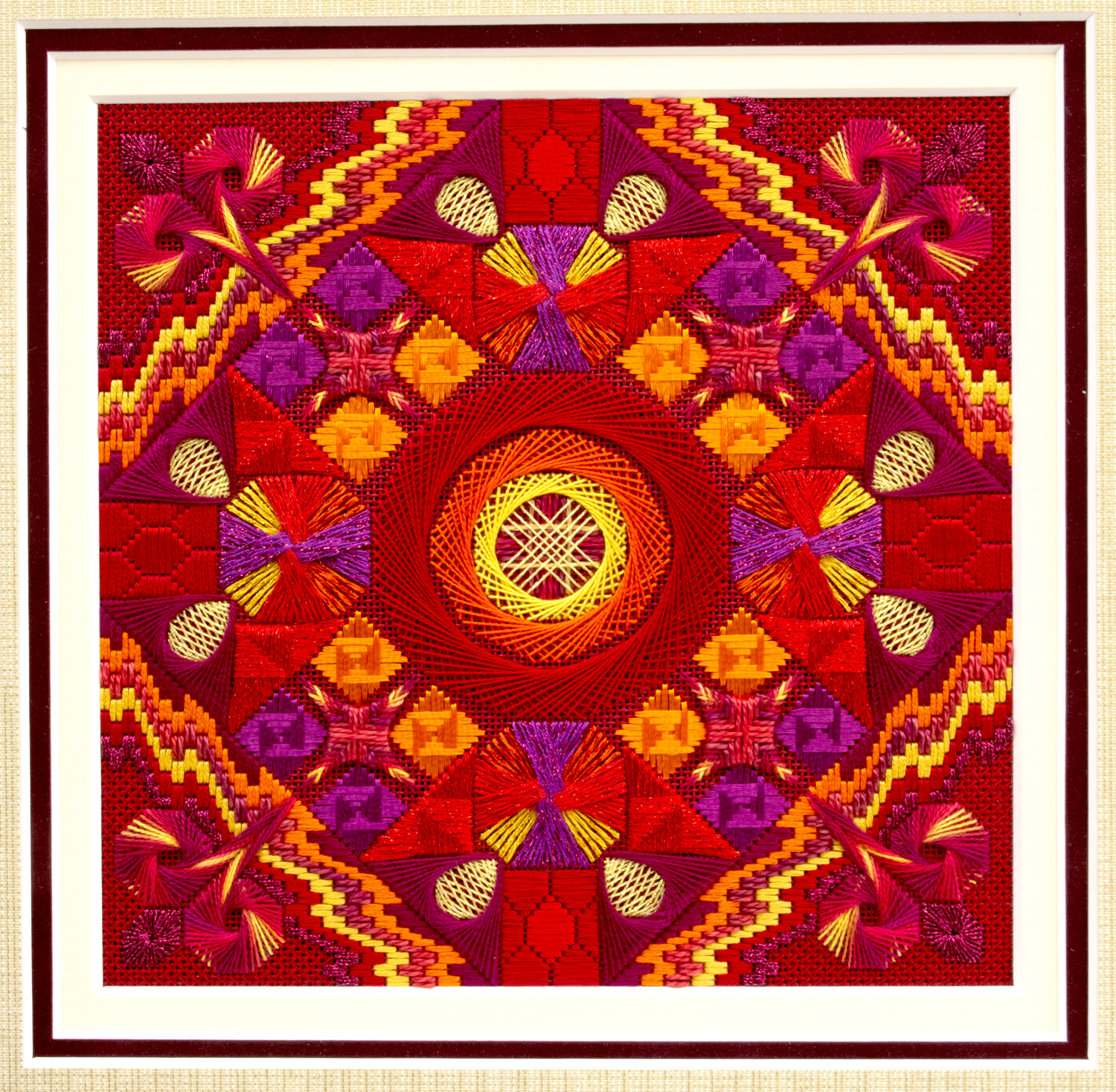 The third challenge was my decision to change the stitch and thread selection in the cardinal blocks (north, south, east, west). These blocks lie between the Amadeus stitches and were filled with Victorian Step stitch worked in cotton and rayon floss. I opted to fill these spaces using a hexagonal lozenge pattern worked in cotton floss, with the central lozenge worked in Neon Rays.
