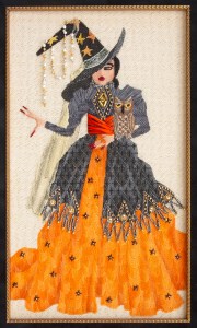 Serafina’s canvas was displayed high on a wall, and she stood out from most other canvases – elegance and presence! It came with a stitch guide, which I used in a few areas but found many of the stitches not what I wanted my elegant witch to convey.