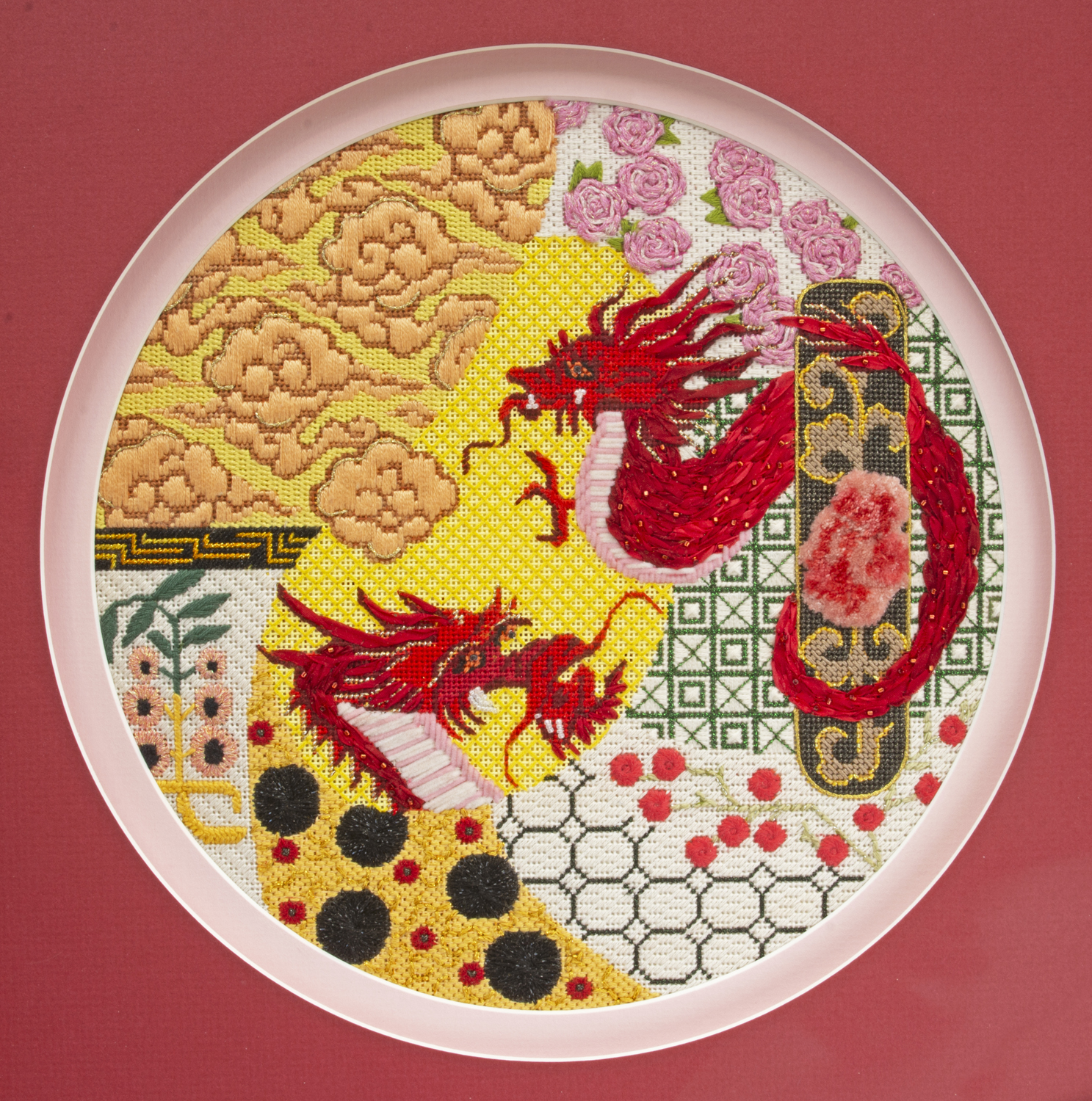 My husband found this canvas at a shop and purchased it for me to stitch for him. I selected my own threads and stitches. I wanted the center to be different from the surrounding components; its inspiration was a mesh bag containing onions. The dragons needed to stand out from the rest of the canvas, so I put it away while awaiting inspiration. An ANG Needle Pointers magazine showed an owl with a wing stitched with ribbon embroidery embellished with beads – perfect for the dragons. Done.