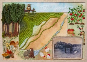 My father Ken was born on an Ohio farm where they raised chickens and grew tomatoes, strawberries, and raspberries. In 1934, when he was 6, a family photo captured him plowing with their mule Susie. Although they sold their land during the Depression, Dad still tried to garden in the clay soil at our home. The first spring I lived in Chicago he brought me tomato seedlings and cuts from raspberry canes he’d grown. My son Ken has left the city and chosen a plot of land in Wisconsin to do a modern version of farming. Being a good steward of the forest, living in harmony with the beavers and squirrels found near the stream, and dwelling sustainably on the property tie my son to his grandfather, forming a bridge from my family’s “agri-culture” in the past to the future. Included techniques span my growth as a needle artist. Gel photo transfer, a central bargello panel of the land’s contour map, and stumpwork and needle woven figures surrounding the design bring past and present together.