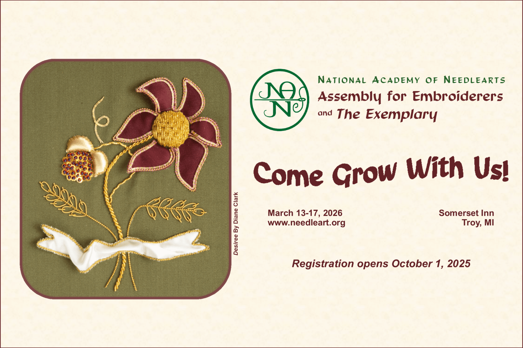 Come grow with us in an environment filled with threads, ideas, laughter, and learning. We can’t wait to see how your needlework flourishes. Check out the class offerings at www.needleart.org/Assembly. Registration opens October 1!
