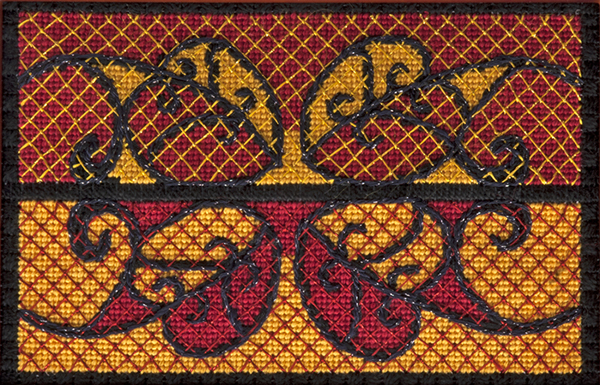 I thought about ways to make the project more visually appealing and more challenging to me, so I decided to work a laid filling over the Basketweave, and to mount the piece in a boxtop. I quickly discovered that I’d need to modify the design to fit in any box, so I analyzed it to determine how I could extend it. The design was lengthened 1″ in the long dimension, and a black border placed around it. For the filling, I stayed with the red and yellow in the original design, but worked it to maximize contrast between filling and background. To make the curved lines more pronounced, they were worked in black stem/outline stitch over the laid filling.