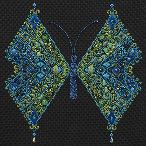 I designed Mariposa as a study in colors and stitches. Its stylized body was done to set it apart. The arrays of stitches that form the wings help the design flow from top to bottom. I enjoyed using a range blues and greens for dramatic impact, allowing the design to “jump” off the canvas.