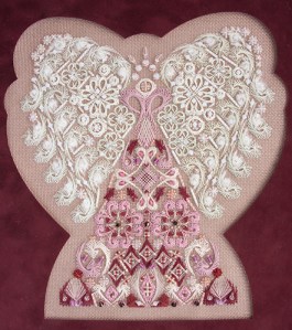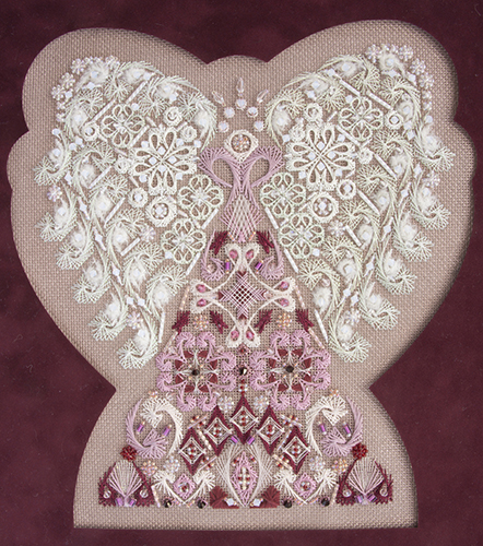 Rescent, short for “Rose Crescent Angel,” is a study of Crescent stitches on Rose Gold painted canvas. When the NAN challenge was announced I had in mind a small angel for a one-day class, and, well, Rescent just kept growing on my computer! Rescent is brought to life using a stitch library consisting mostly of variations of the Crescent stitch, along with Jessicas, Mistakes, and Plaited Ray stitches. In keeping with the shimmery images of angels in my mind, Rescent is stitched with an array of lustrous threads that include Soie Perlee, Petite Silk Lamé Braid, Elegance silks, Petite Very Velvet and Accentuate, Kreinik, and Treasure Braid metallics. Rescent is embellished with crystals and beads to make her glimmer like the angel she is.