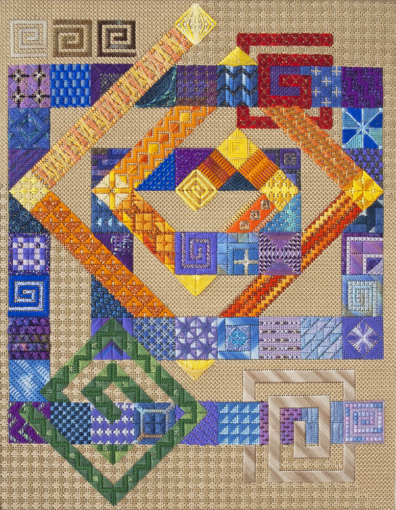 The key to any Challenge is to be passionate about the subject matter. A good friend, Dawn Pollard, while at a stitching retreat, challenged me into this with these words, “Six colors, One Shape…, GO!” By the end of the day this design came into being. Using the color wheel for the 6 colors, I twisted, turned, flipped, and most importantly, inter-locked the design like so many square paperclips. Using many varied stitches and some interesting combinations along with as much of my stash as I could, “Challenge is Key” grew on a daily basis. I chose to play with dimension as well as the fluid nature of design shape itself. I tended to simplify color choice along the way.