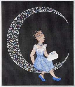 Stitching to the Moon is a whimsical piece inspired by the DreamWorks logo. The stitching figure is worked in mostly embroidery stitches, and the fabric on which the girl is working is an actual real piece of fabric. The moon is studded with various attachments such as sequins, flat backs, paillettes, and beads. In addition, a few stitches that can stand on their own—like Smyrnas, four-way Continental, and Diamond Cross are used to fill the moon. I also used various star shapes, some found in books and online, and some of my own device.