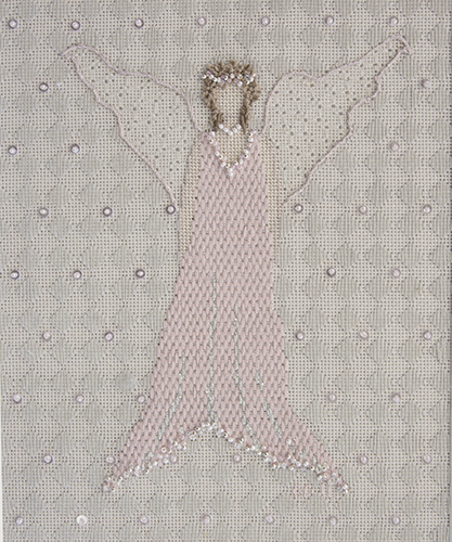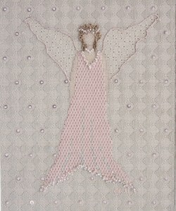 My Angelique is a demure little waif of an angel, rendered in the palest pink with accents of silver. Her wings are worked in a lacy pulled thread stitch. I was inspired by a group of paintings I saw on Pinterest, although I changed colors, and of course, mine is worked in embroidery stitches, not paint.