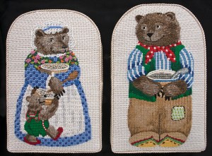 Since we collect bears of all kinds, he asked me to stitch this set for a book shelf in his home office. I used some knitting yarn and a variety of threads for a 13-mesh canvas.