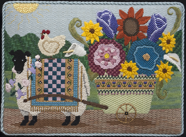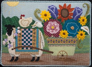 I selected this Brenda Stofft canvas to demonstrate several ways for flower petal stitches. The class enjoyed learning a variety of stitches, not only for flowers, but also a sheep, a rooster, as well as a fast darning pattern for the sky.