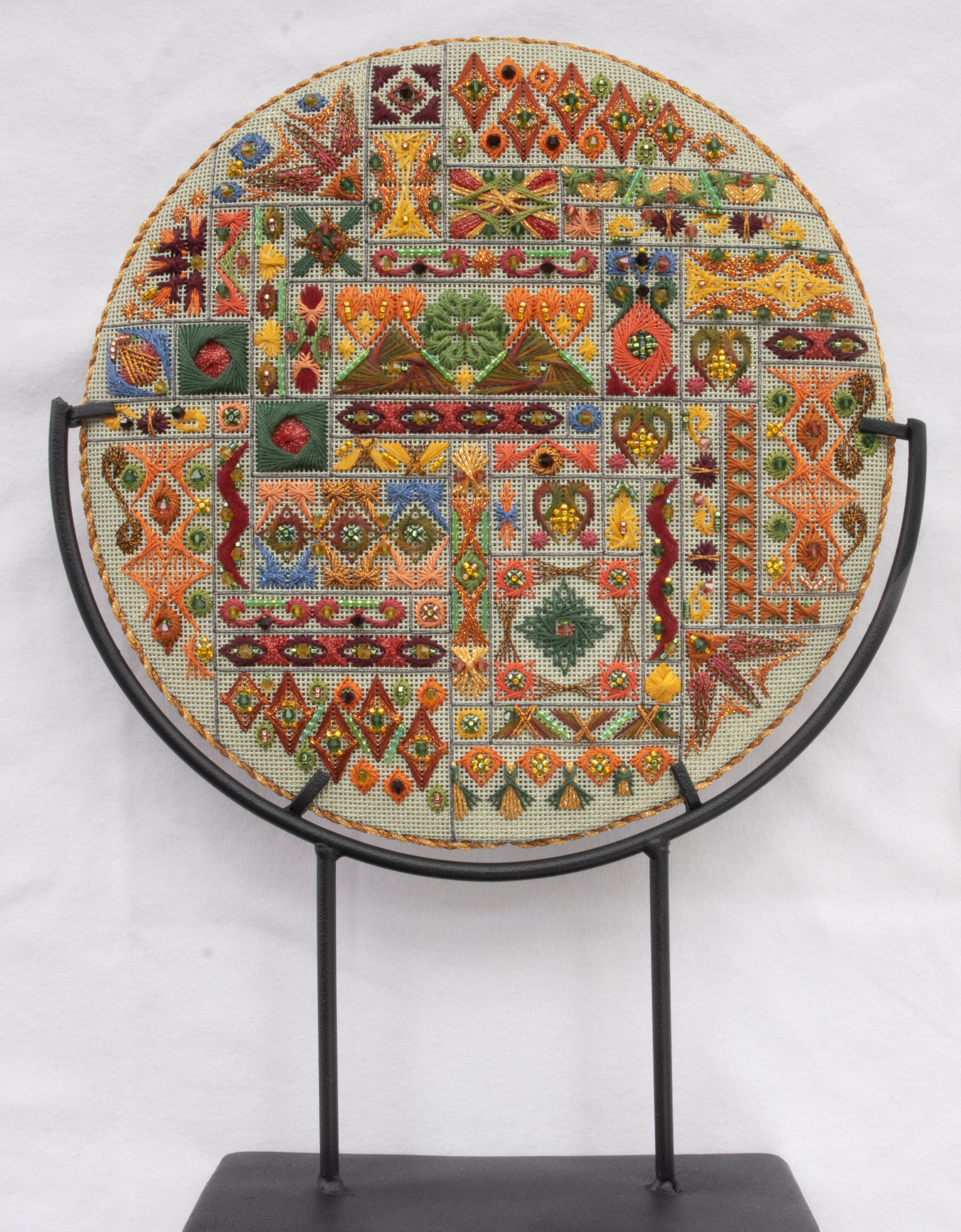 In true Kurdy Biggs fashion, the piece is chock full of Jessicas, crescents, beads and crystals. The effect is reminiscent of a stained-glass window, and the silk lame backing adds to the sparkle. The choice of the stand for display, rather than a traditional framing, adds interest.