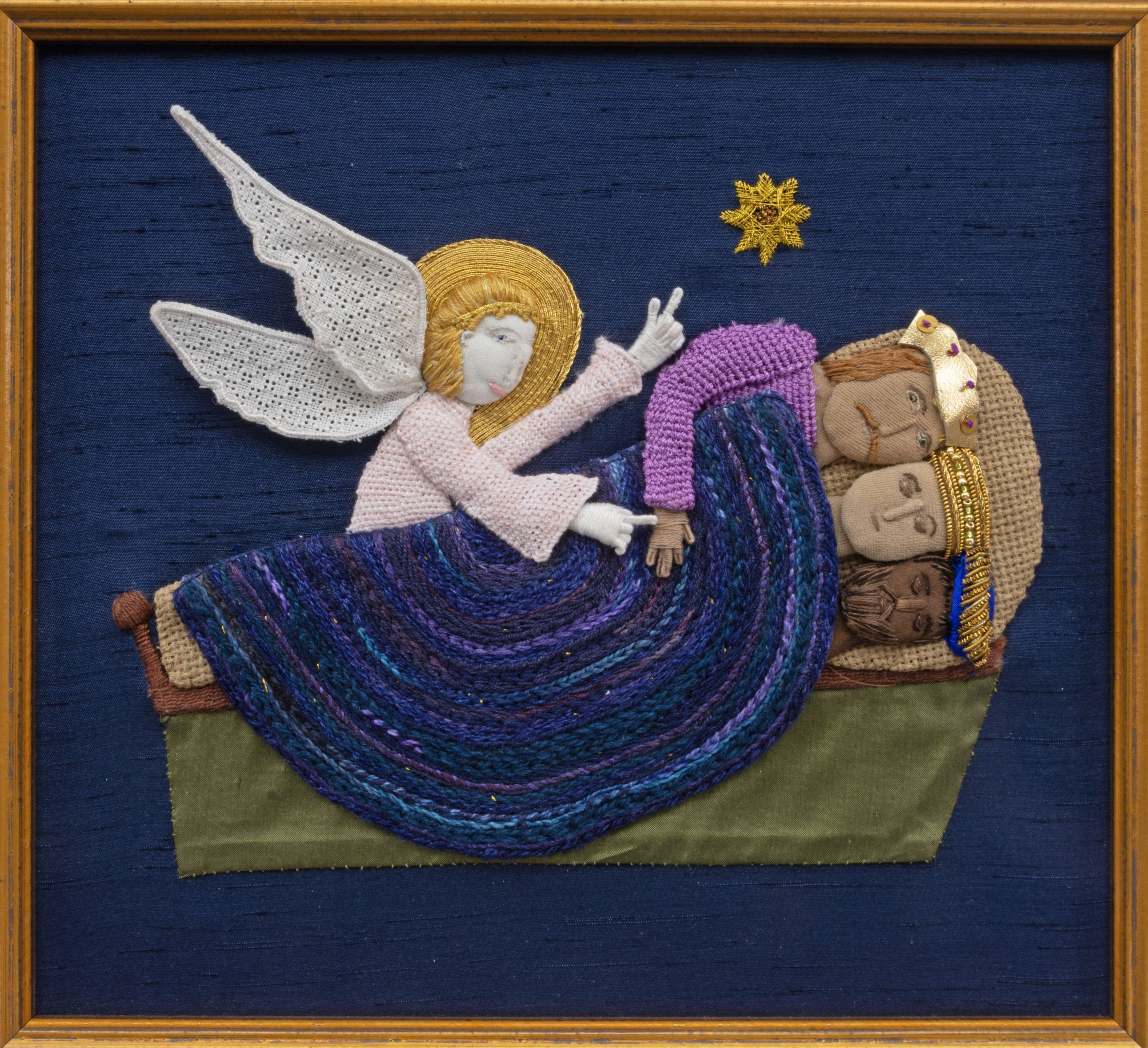 This is a needlework adaptation of a sculpture by Giselbertus that appears on a cathedral in Autun, France. The image captures the moment when the Angel tells the Magi not to return home the way they came, so as to avoid Herod. Decisions about color, texture and threads made this a challenging project to adapt to needlework. Stitched on a background of blue silk, the Magi are in a rustic bed under a coverlet stitched on canvas and appliqued to the ground. The faces are in a standard stumpwork technique, each using a different color of pantihose remnant for flesh tones. The fingers are wrapped and molded wire. The angel and one Magi have needlewoven clothing. Angel wings are pulled work done on evenweave fabric which was stitched to wire, then cut out and applied. The halo and star are gold work techniques, as are the crowns.