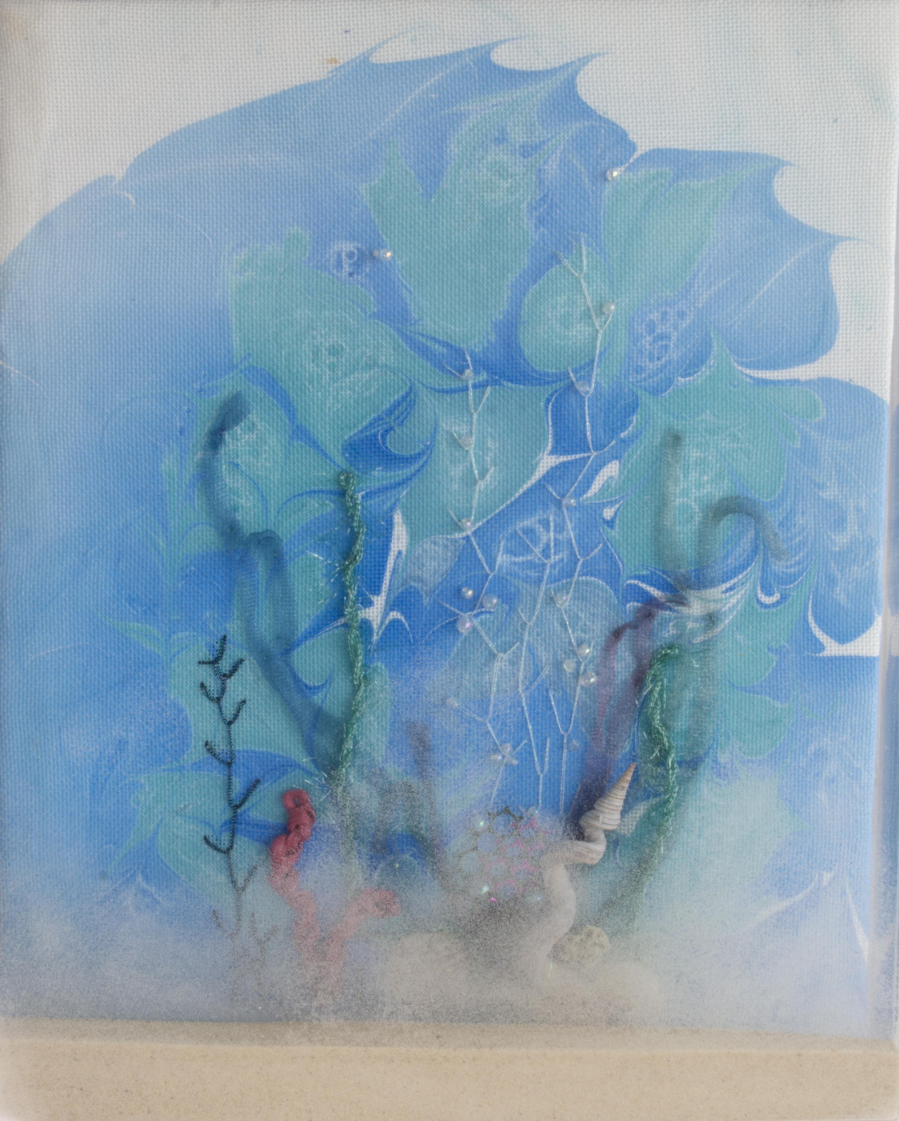 This piece was created several years ago. It began in a class with Peg Laflam. We were shown how to marble canvas and proceeded to create our own design. It was fun to see the different patterns develop from the paint blobs that were dropped onto the water and then manipulated. Next step was to choose a marbled canvas and stitch. Underwater pictures and others were available for design inspiration.
