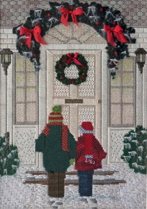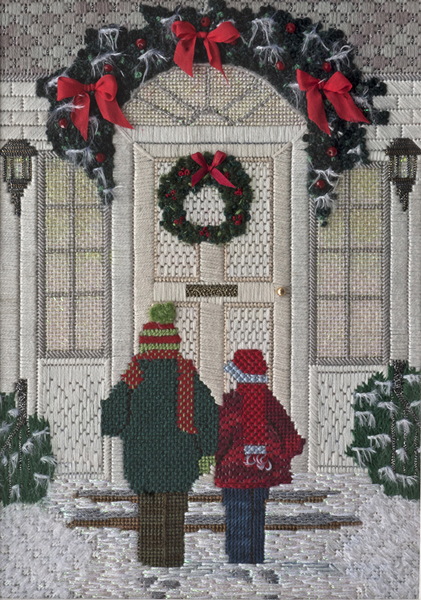 Inspired by a Christmas card, the design was enlarged and transferred to canvas. It was then treated as a “painted canvas” and stitches and fibers were decided upon as the piece came to life. The execution of the snow was the most challenging. The piece needed to portray the “fluffiness” of the snow as well as the depth versus the dusting of snow. Many stitches and fibers were tried before the final outcome was stitched.