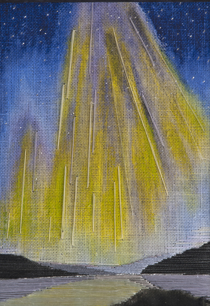The background was hand painted linen, using acrylic paint. I stitched tiny stars in the sky with silver metallic thread, to provide the scale for the landscape, and to reinforce the transparency of the light. The most challenging to represent were the light rays. In places I used a half strand of Japanese flat silk thread in lavender and gold, blended with several strands of invisible thread. In other places I used invisible thread only, or a half strand of Japanese flat gold only.