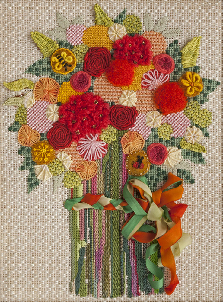 I followed the color scheme on the canvas so choosing the colors was relatively easy. It did not have a stitch guide so I decided to concentrate on practicing different stitches for circles. To my surprise, I really liked doing the bullion stitch. I used silk, cotton and wool threads. I also appliquéd wool fabric on a few circles and then embroidered those to make it more interesting and dimensional. I enjoyed stitching this piece and was really delighted with the results.