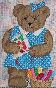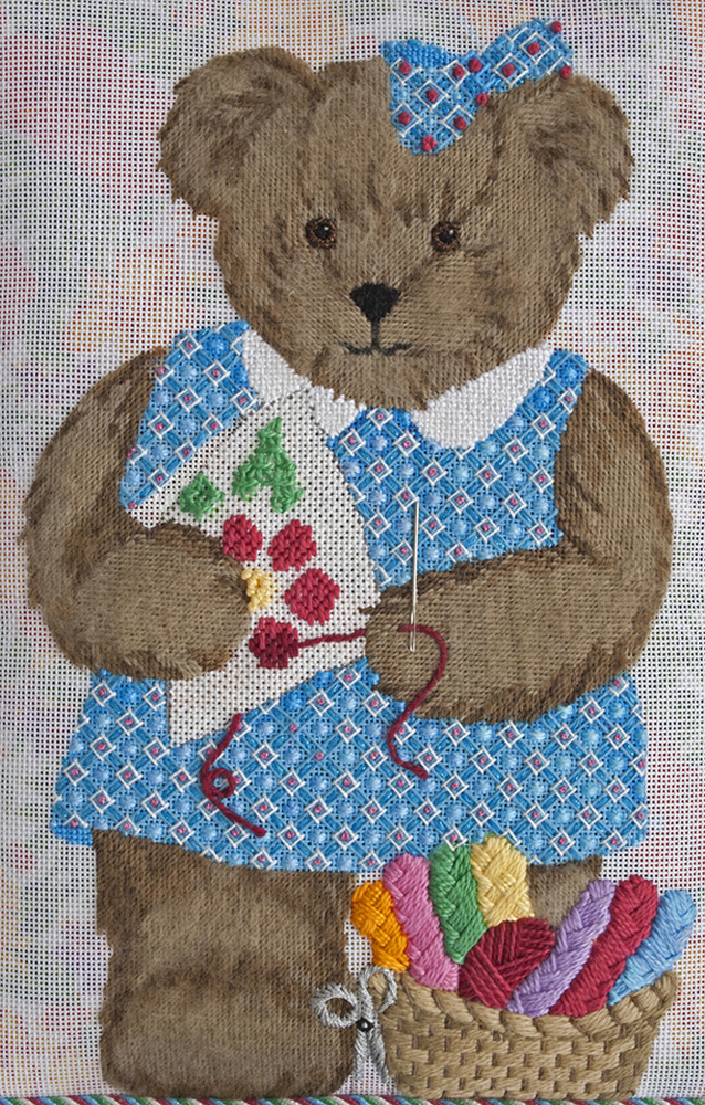 My name sake: The Needlebear. The simple pattern for the dress became a complex design. Her canvas was made to look real with 4-way continental. To make the skein look more realistic, the Point de Tresse stitch was done. Not wanting to stitch the background, I found a colorful fabric that reflected colors in the piece to be placed behind the negative space.
