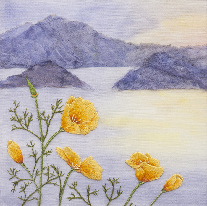 The hills are constructed by searing the edges of hand-dyed silk organza, and attached using invisible threads. The poppies are golden California poppies, needlepainted with long-and-short stitches, with bullion knots for the stamens.