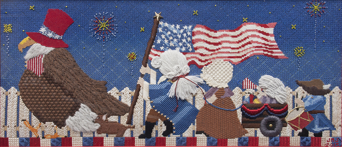 This Tapestry Tent canvas was stitched using the stitch guide by Susan Portra, published in three issues of the Needlepoint Now magazine. In the stitch guide, the option was given to ‘paint out’ the dog on the canvas and extend the eagle’s feathers in its place. Obviously, I elected to keep the dog! Threads were kept close to the recommended threads in the stitch guide, and interpretation and instruction were provided by Lynne Bay, owner of Needlepoint for You in Troy, Michigan.