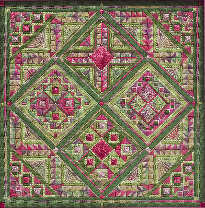 I used an eggshell 18 count canvas cut to 15 inches by 15 inches. First I found the center of the canvas, and using the chart provided, I began to stitch. This piece called for only four different kinds of threads: Caron Watercolours, Fyre Works, Kreinik and perle cotton.