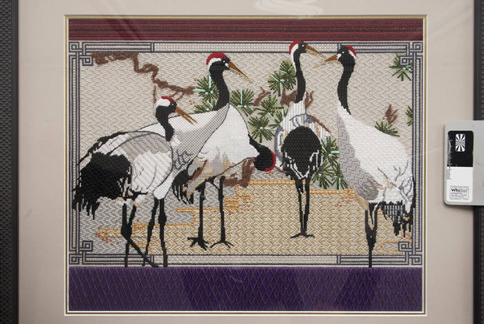 I was drawn to this pinted canvas the first time I saw it. It is beautiful and delicate. I worked with Shay Pendray, and several Japanese Embroidery techniques were incorporated in this piece. I also had hand surgery while working on this piece so Shay gave me some easier fibers as Silk and Ivory to use. The bottom part was originally gray but Shay suggested purple, and after several attempts we came up with this design.