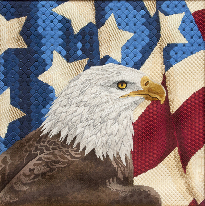 I was inspired to stitch this piece to honor my husband’s more than 24 years of military service in the U.S. Army. This patriotic design, painted by Liz Goodrick Dillon, reflects my husband’s deep love of country and is symbolic of the strength and courage found throughout our military. With the guidance of my instructor, Kathy Stolpin, I recreated the feathers of the eagle’s head as realistically as possible with a combination of wool/acrylic blend and silk fibers. I worked the eagle’s body with silk fibers in tent stitch with an overlay stitch suggesting feathers, to allow for an intricacy of shading. Further shading on the flag in the background, worked with silk, cotton, and metallic fibers in a variety of stitches, was important to convey a sense of dimension in the piece and add to the overall composition, while not overwhelming the bald eagle as the focal point.