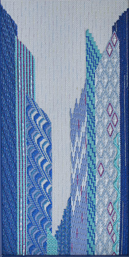 An abyss, chasm, or crevice displays the icy realms of the earth, but also can mean a profound difference between people. This piece, a companion to my Fire and Ice piece, uses dramatic stitches to create the icy cold perfection in the high and low columns that represent the icy crevasse. The background continues the feel with a sparkly darning pattern that could be icy snow or sleet. Both the pale blue congress cloth and the use of silks with silk/metallic combinations help to further display an icy realm.