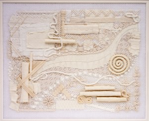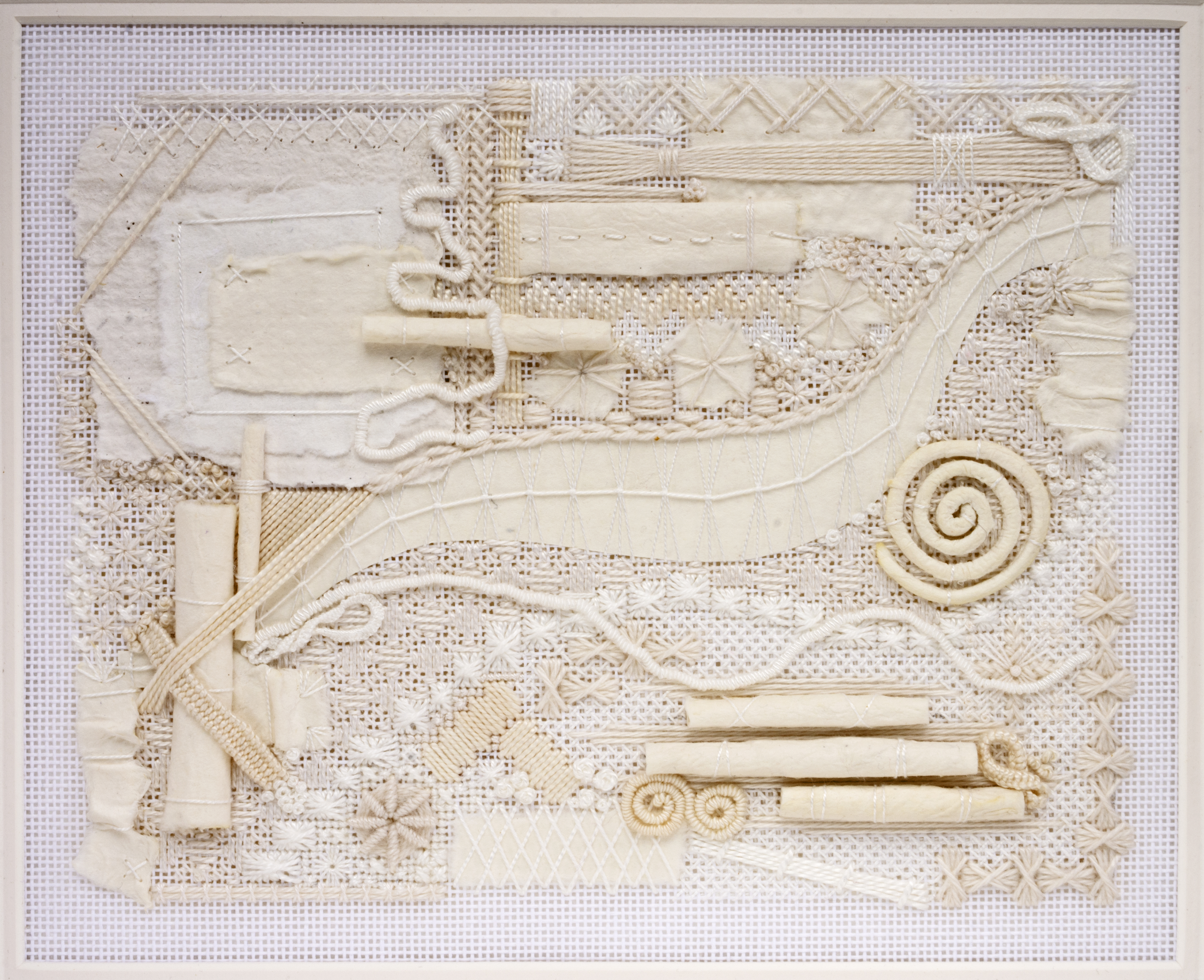 The focal point is the main path of the winter storm, which uses a shape cut out of handmade paper and secured to the canvas using the Butterfly Chain Stitch. Another path uses Rhodes stitches in various sizes and shapes. Exploding snowballs are represented by torn circles of paper attached with a large Eyelet and a Ribbed Spider. Snow covered logs are created from wet paper which has been rolled into a tube. The cyclone was created using a long piece of paper rolled into a tube then made into a swirl. Additional texture is added with fake Bullions, Herringbone, Cross Stitches, Couching, Palace Pattern and Fan Vaulting.