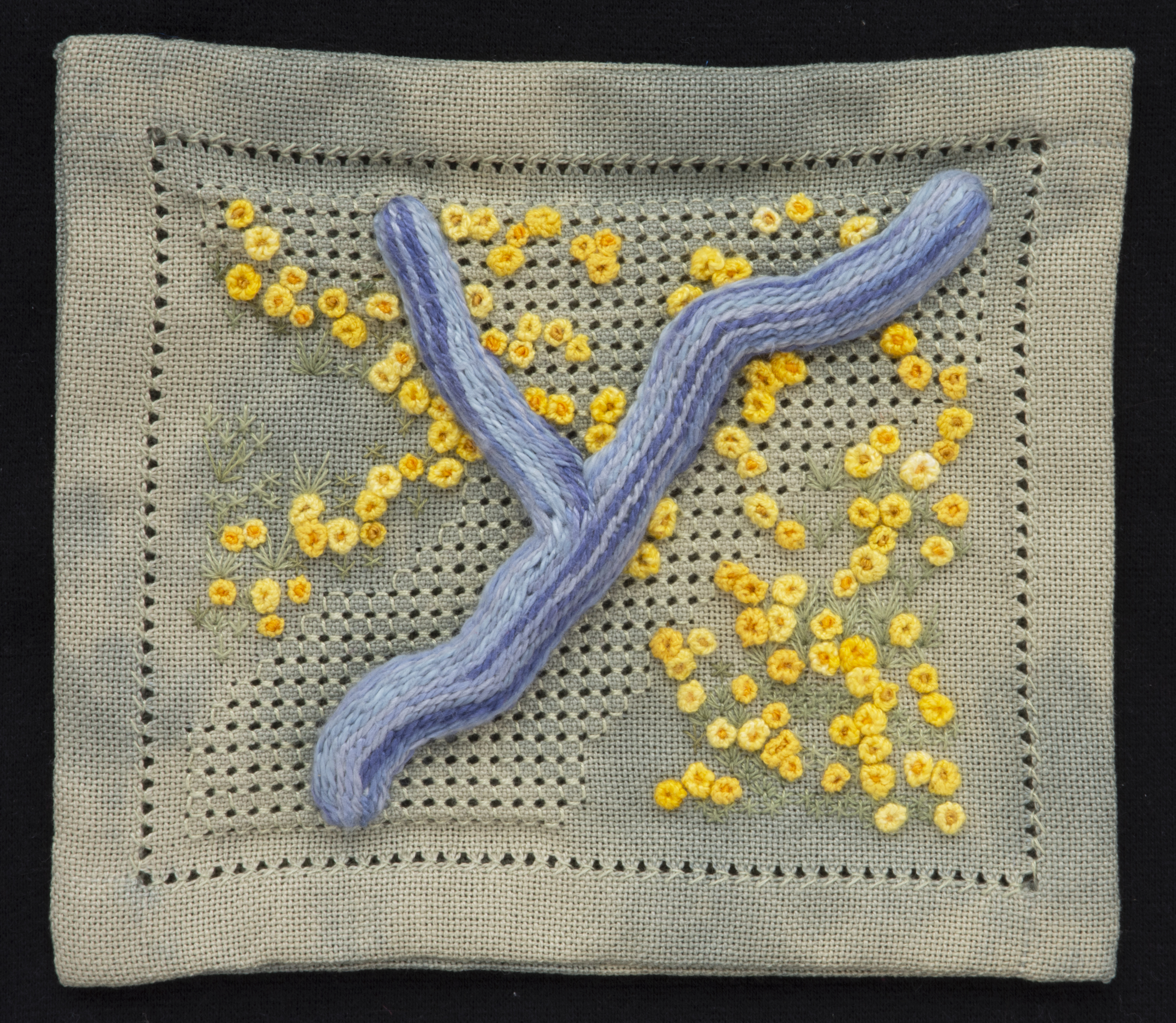 The skeletal texture of a dried cholla cactus sits on the desert floor, surrounded by the very much alive yellow wildflower blooms. The complementary colors speak to the opposites of death and life, hard and soft. The cholla skeleton is created with Casalguidi stitch (raised stem band) on an irregular ground area of four-sided stitch. The delicate yellow flowers are a combination of French Knots and other surface stitches.