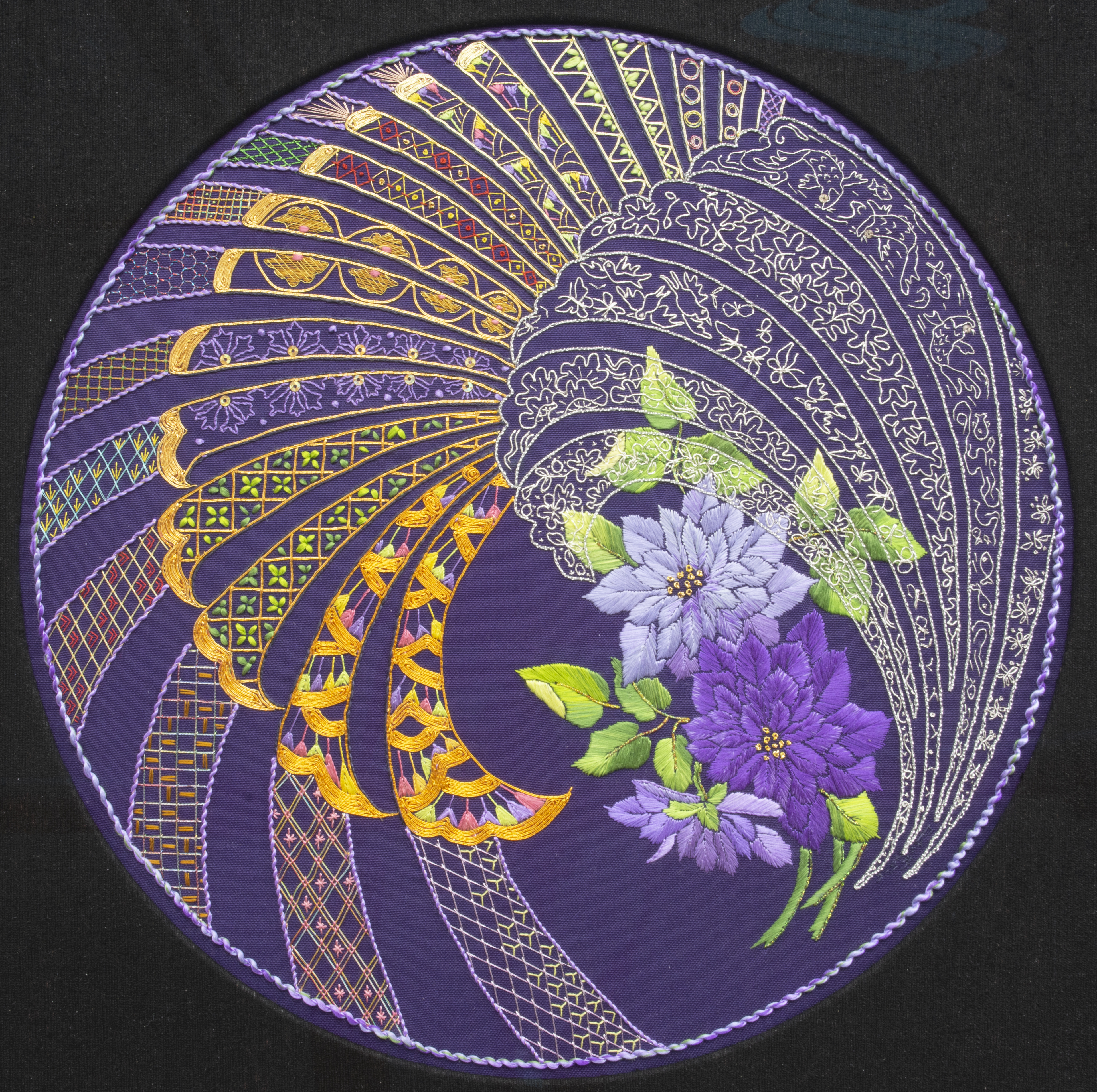 The outer fan completes the circular motion, each section being stitched in various geometric patterns.