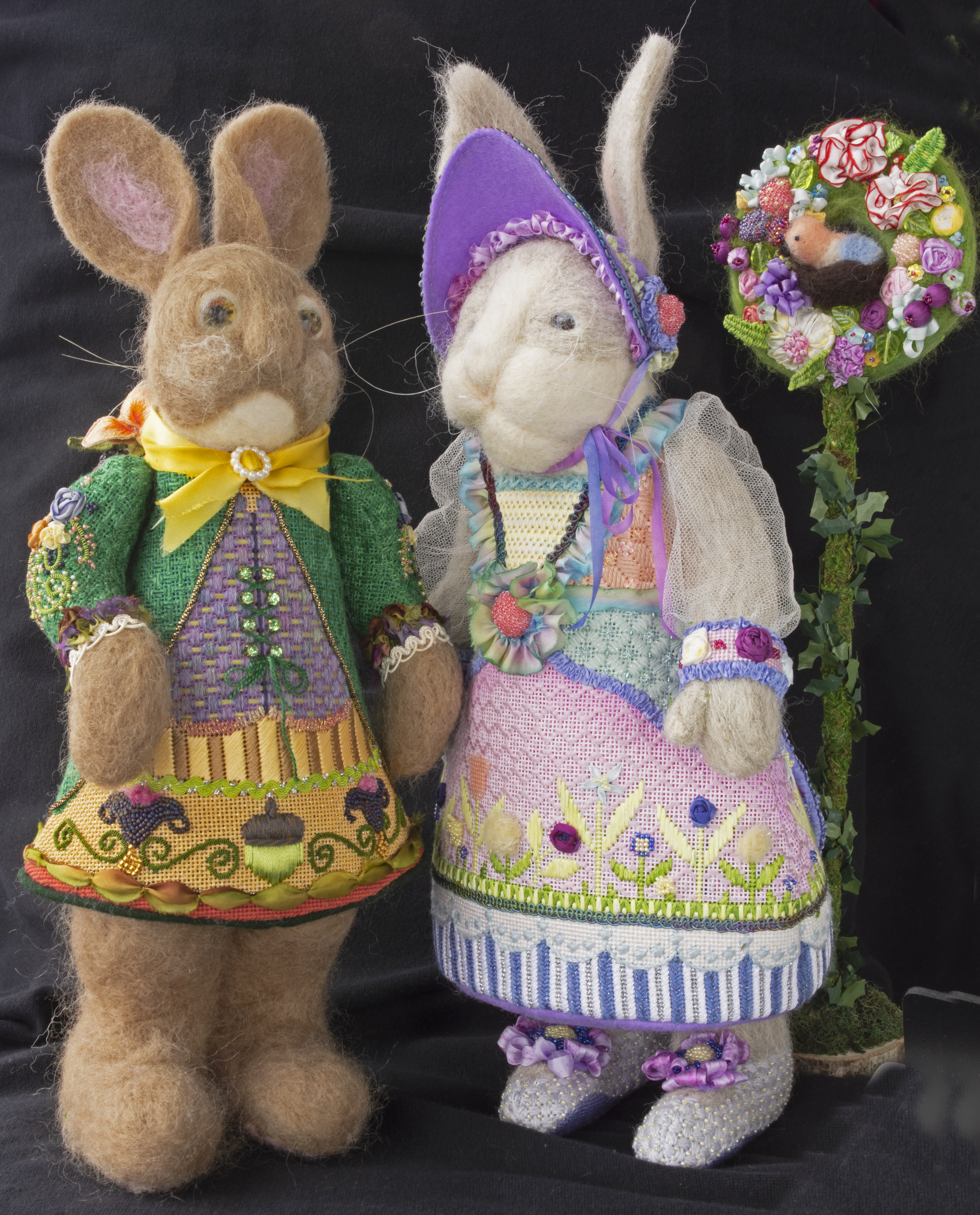 Astrid and Artemis 3D bunnies are the creation of needlepoint designer Brenda Stofft. During the four-day class (per Bunny) you learn to sculpt the face, arms and feet by needle felting directly onto the painted needlepoint canvas. Previously, judges assumed I purchased the face, hands, and feet and were not aware I had hand sculpted them. The various stitching techniques are reviewed and explained during class period. A wide variety of surface embroidery and Stumpwork is included with the canvas stitches. I completed the entire finishing process myself, taking over a month per rabbit. Artemis’ basket is full of Stumpwork and lampwork beads, and was a challenge to attach and decorate with handmade flowers and butterflies. Astrid’s staff contains silk ribbon work and beads along with a baby bird in a hand-felted nest. Her dress and hat required yards of hand rouching using a variety of silk ribbons. These bunnies are a labor of love.